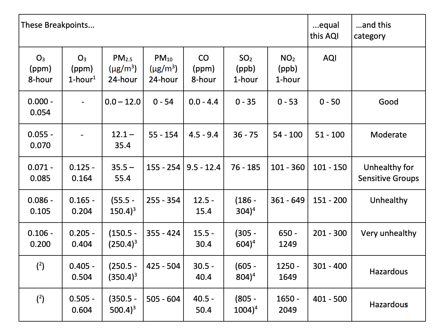 An interpolation is done with the health breakpoint concentration ranges to get the AQI. Below is a example table referenced through a document related to US agency The health breakpoints are subjective to the impact of pollutants on the resident population - and hence such breakpoints might differ with countries.