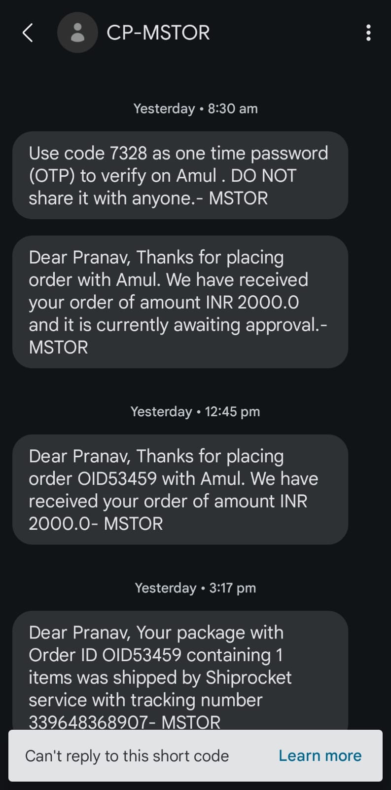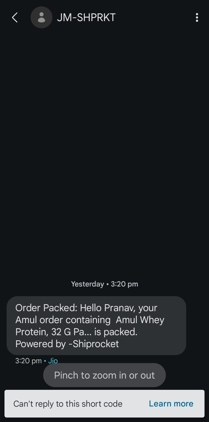 - ‘Order Packed’ — context shared without requiring to open full SMS
