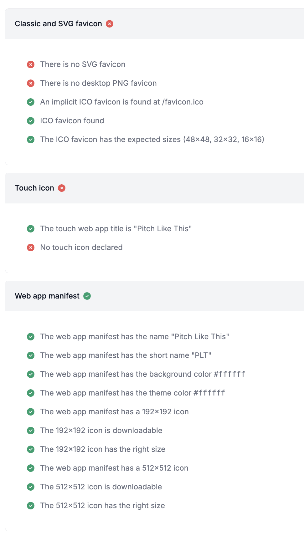 /appbut finally decided to not do that.I used realfavicongenerator.net to test out the dev and favicon and manifest are working fine but apple icon, svg and png icons show failed. However I can see in devtools that all these icons are being populated each with a url param