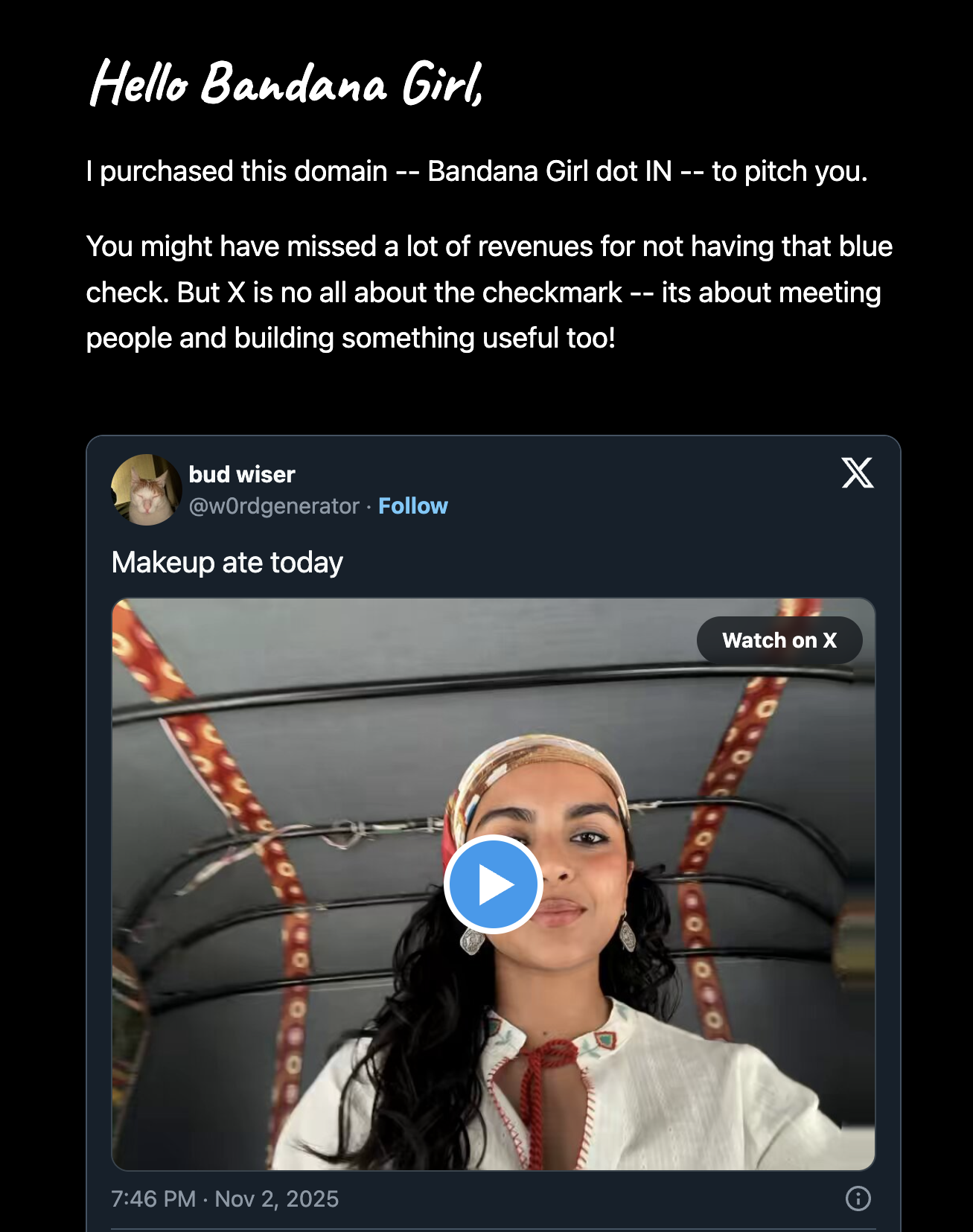 - And the CTA was my X profile - where one can check for authenticity and DM