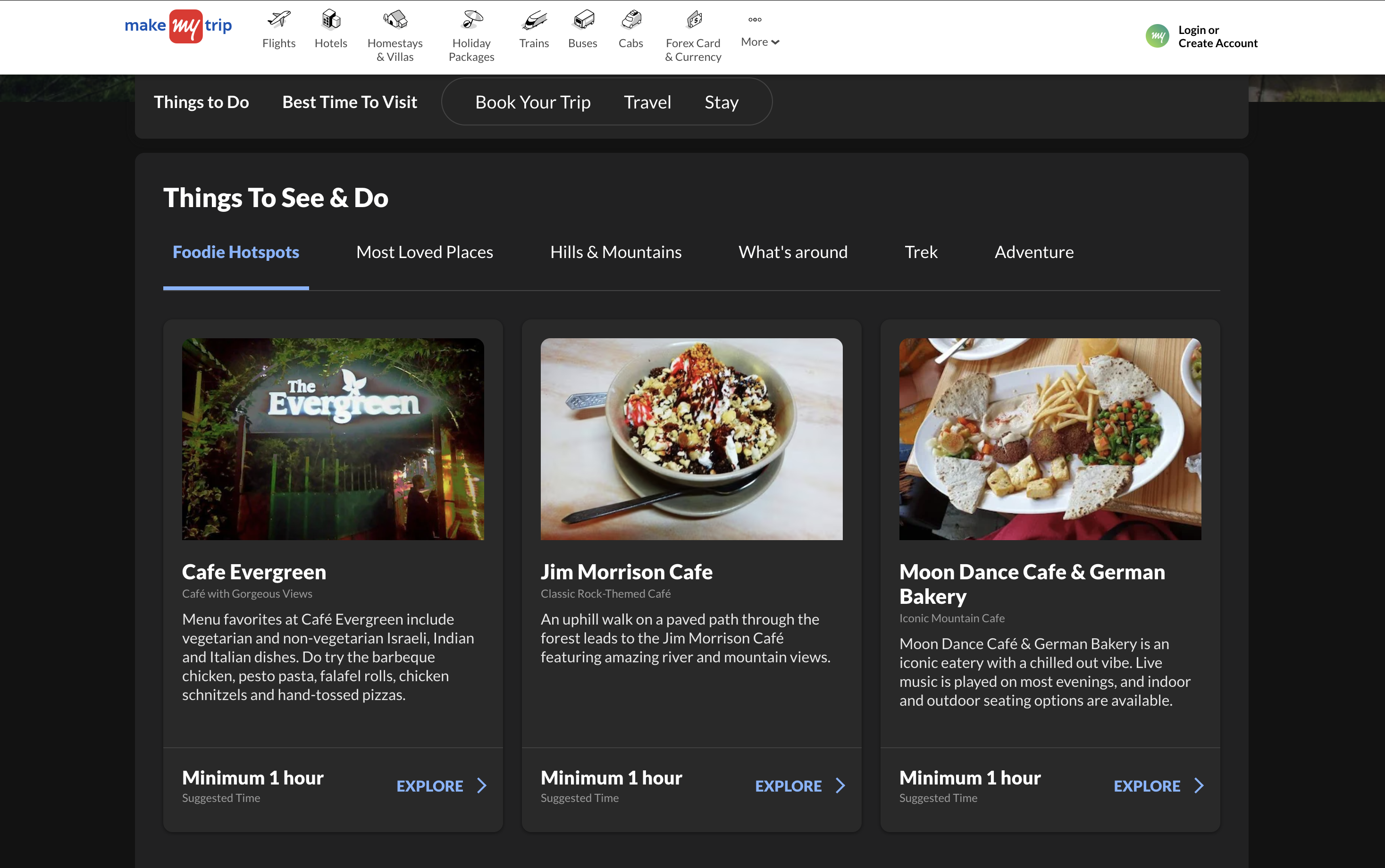 MMT has this Where2Go feature, where each location is listed with a curated list of places to visit. These are static - and the main goal of this page is for user to easily Book Trip → Travel → and Stay.