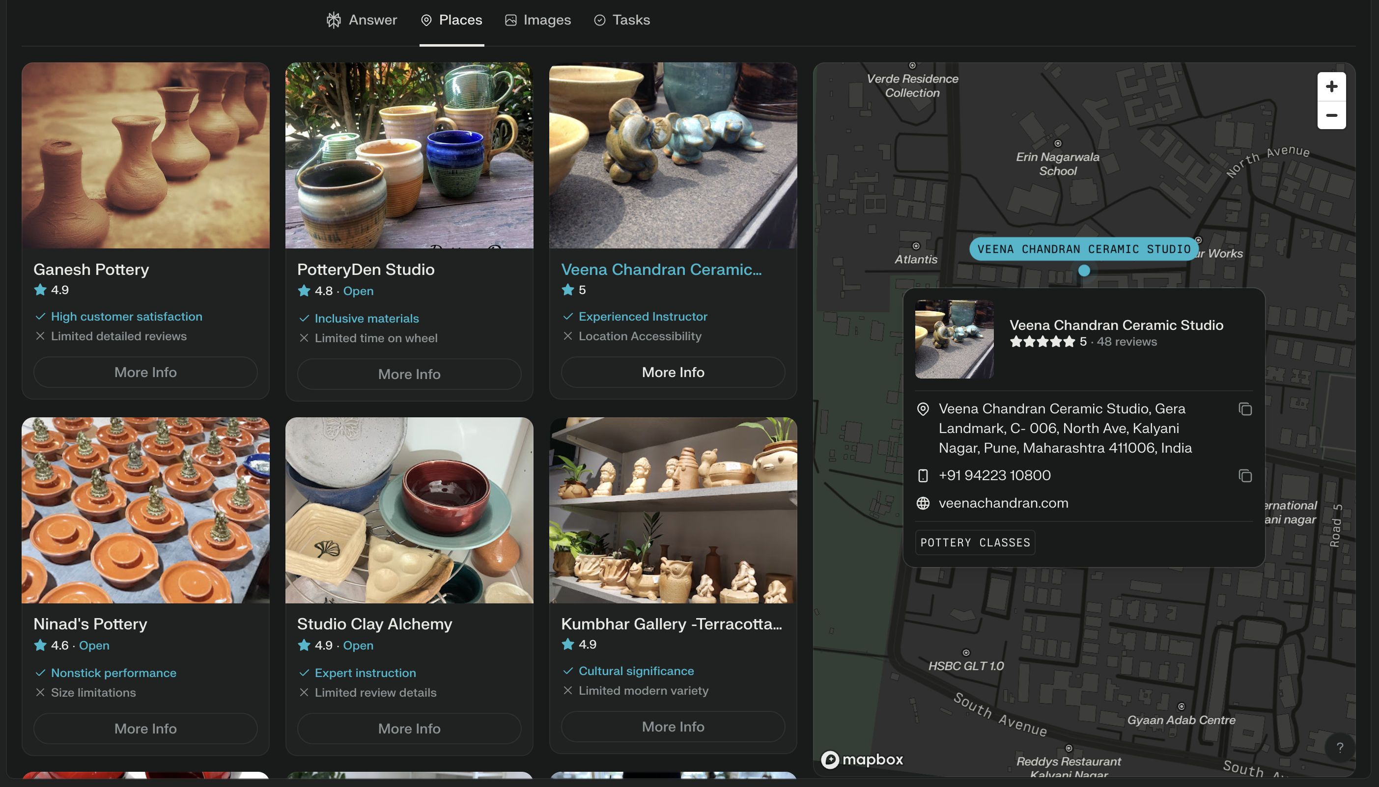 The ‘Places’ section has the real use case - as unlike LLMs that will provide answer is chat format, Perplexity will list it down in a Map based UI. If you click on the ‘More Info’ the map zooms to show more details like address, phone, website, timings, and place tags. Shows ratings, but does not show reviews - for reviews the user will have to go to the Google Search.